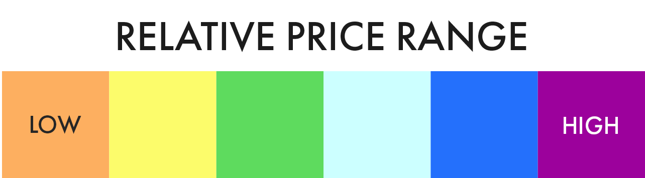 EleMar categorizes each material in a 6-tier price range that tells you where each stone’s price range falls relative to others in our inventory. When you visit, every natural stone material will have a placard that uses this chart to display the price range using a color tier.